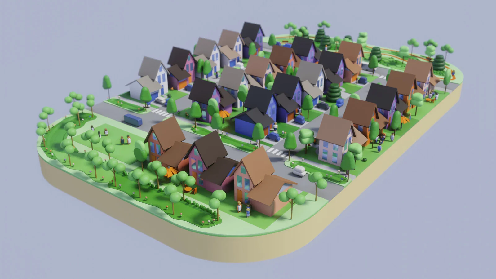We were inspired by the work of the painter Wayne Thiebaud who paints landscapes AND pastries. The design of this Lilliputian New Jersey started with a color palette whose colors each captured a different aspect of the environment we were trying to communicate (water, green, amenity, atmosphere, etc). The forms for the models were pulled from a common vocabulary of generated shapes.